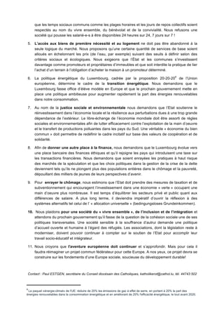 La commission luxembourgeoise « justice & paix » et le conseil diocésain des catholiques ont proposé onze pistes de réflexion pour un renouveau sociétal en réponse à la crise économique et sociale actuelle. Ces suggestions se fondent sur le respect de la dignité humaine, la solidarité et le bien commun, et discutent de divers aspects allant de la bioéthique à la politique énergétique. Le document appelle à un équilibre entre l'intérêt économique et les valeurs humanistes pour promouvoir une société plus juste et inclusive.