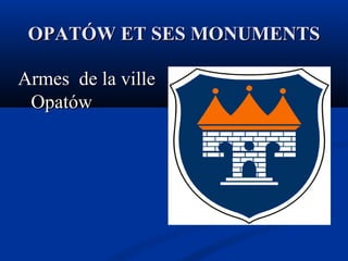 Opatów est une ville polonaise historique située dans la région świętokrzyskie, connue pour ses monuments, dont l'église Saint-Martin et le monastère baroque des Bernardins. Fondée au XIIe siècle, elle a reçu des privilèges de ville en 1361, et a été enrichie par le noble Krzysztof Szydłowiecki au début du XVIe siècle. La ville abrite également la porte de Varsovie et d'autres attractions historiques telles que des souterrains médiévaux.