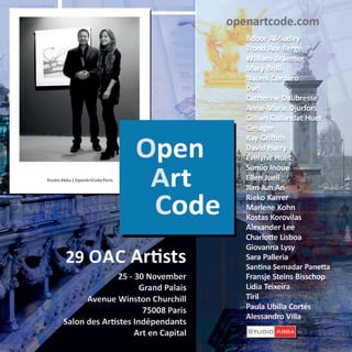 Le document présente l'exposition OpenArtCode qui se tiendra du 25 au 30 novembre 2014 au Grand Palais à Paris, regroupant vingt-neuf artistes internationaux du groupe. Chaque artiste apporte une approche unique à l'art à travers divers médiums et styles, reflétant un mélange de traditions culturelles et de techniques contemporaines. Le texte souligne l'importance de l'organisation et de l'esprit collaboratif dans la création de cet événement prestigieux.