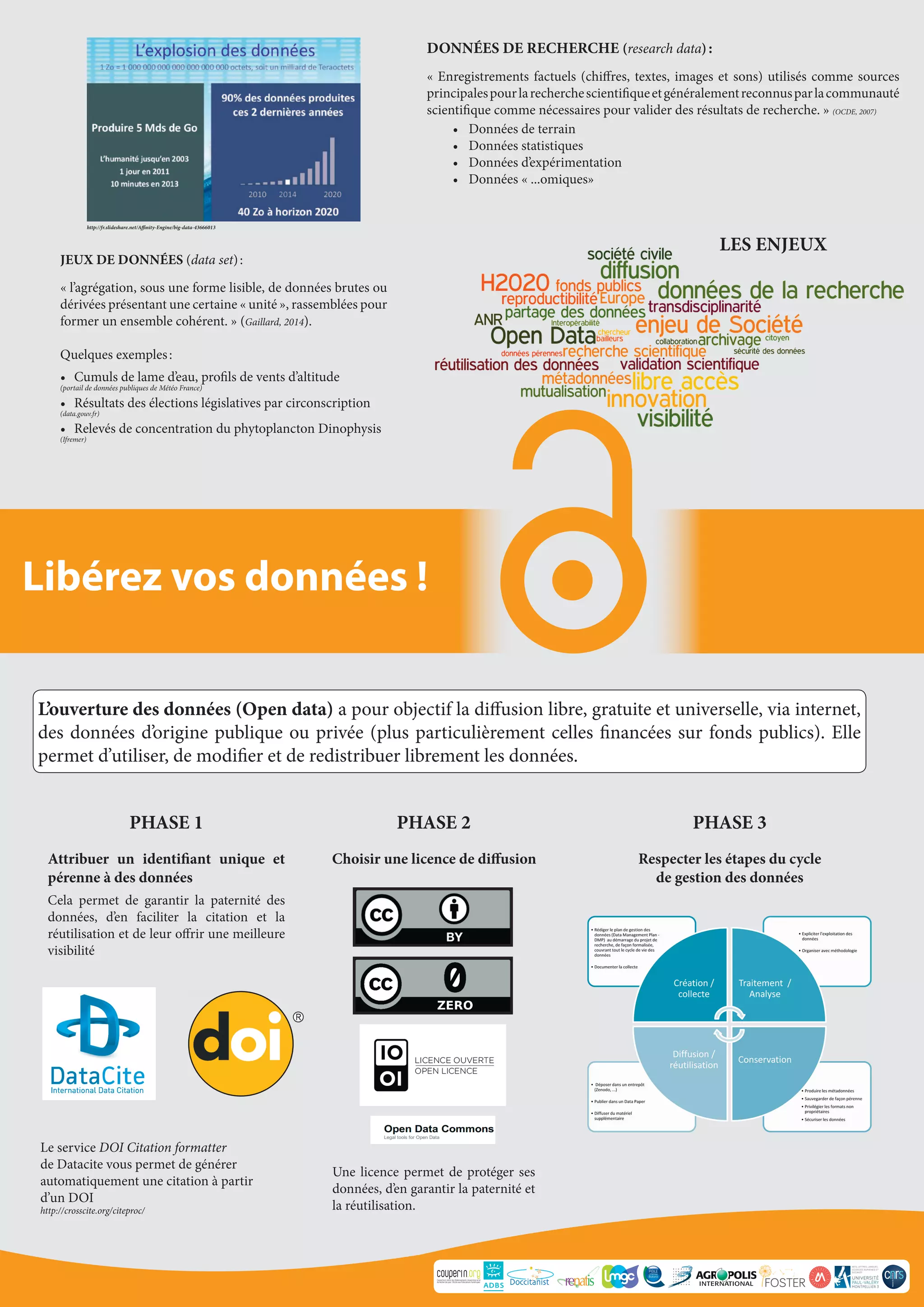 L'ouverture des données vise à diffuser librement les données publiques ou financées par des fonds publics, permettant leur utilisation et redistribution. Le document propose une méthode en trois phases pour gérer les données de recherche, incluant l'attribution d'identifiants uniques, le choix de licences de diffusion et le respect des étapes de gestion des données. Il présente également des exemples de jeux de données significatifs utilisés dans la recherche scientifique.