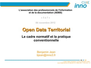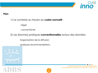 Le document présente le cadre normatif légal et conventionnel autour de l'open data territorial, en abordant notamment la propriété intellectuelle et les bonnes pratiques pour la diffusion des données. Il met en lumière les exigences légales de transparence et de réutilisation des informations publiques, ainsi que les défis liés à la protection des données personnelles. Enfin, il souligne l'importance des licences libres pour favoriser un écosystème de partage et d'innovation.