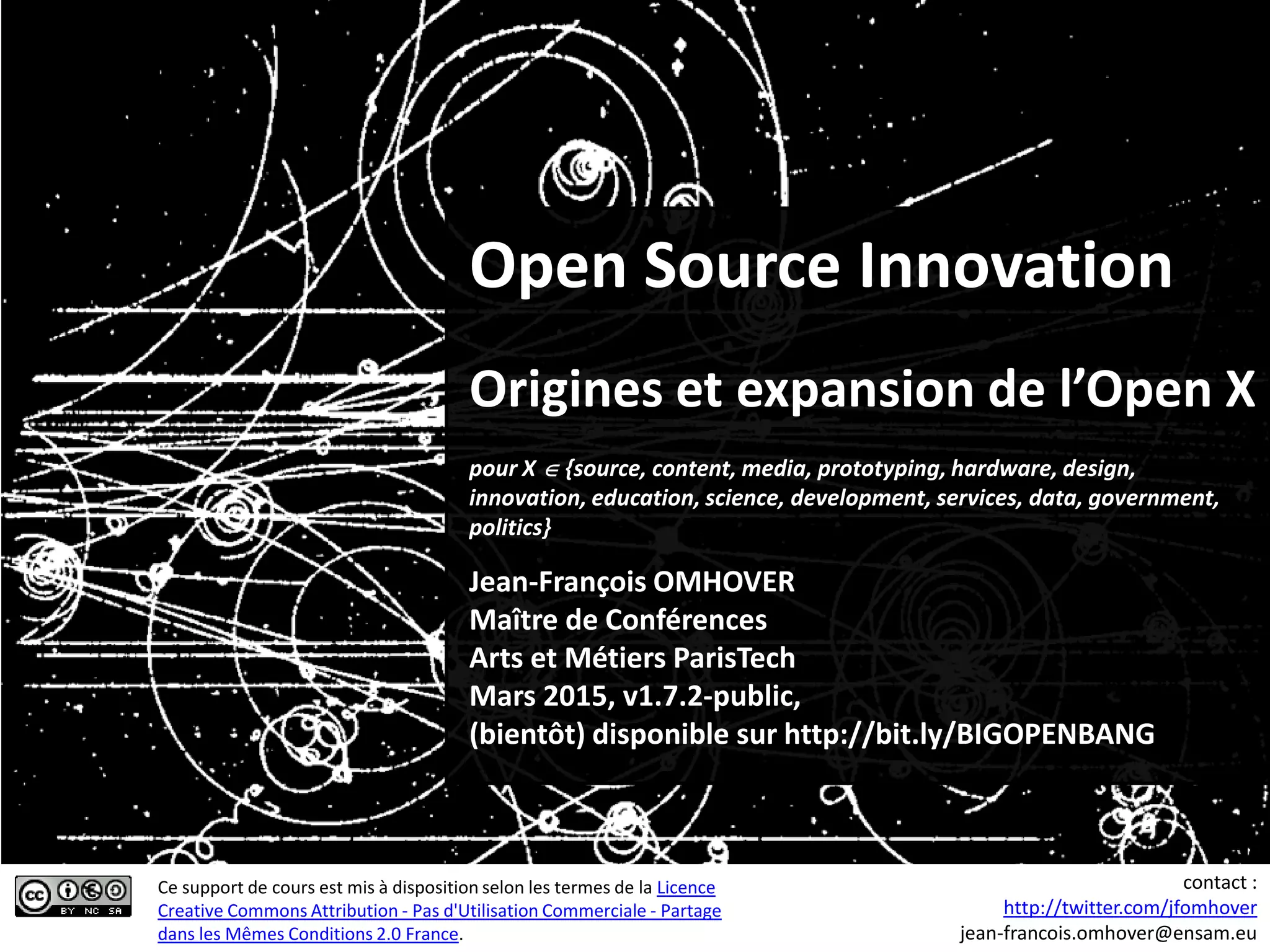 Le document présente l'innovation open source, en mettant l'accent sur son évolution historique et ses fondements, notamment avec des concepts comme le partage, les plateformes numériques et la propriété intellectuelle. Il explore également les dynamiques de production communautaire et les implications de l'open hardware dans des domaines tels que l'éducation et les services. Enfin, il aborde les défis et opportunités associés à l'expansion de l'open source dans divers secteurs.