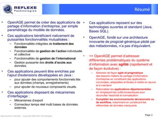 Openage est une application web flexible et évolutive permettant de créer des solutions de partage d'informations d'entreprise par simple paramétrage. Elle offre des fonctionnalités puissantes pour la gestion des données, des actions et des droits d'accès, tout en étant construite sur des technologies standards comme Java et SQL. Grâce à son architecture innovante, Openage permet une réponse rapide et efficace aux besoins métiers variés des organisations.