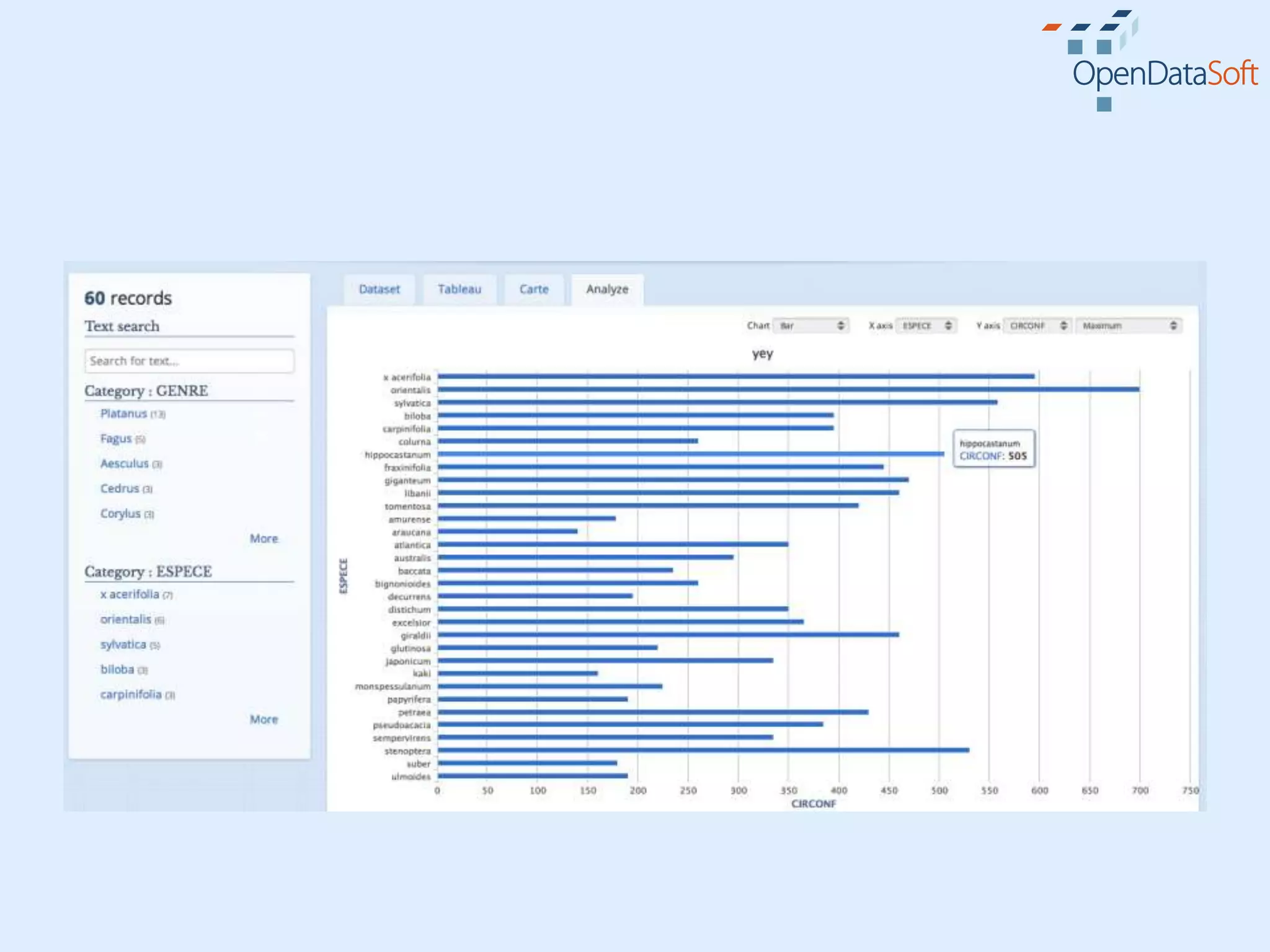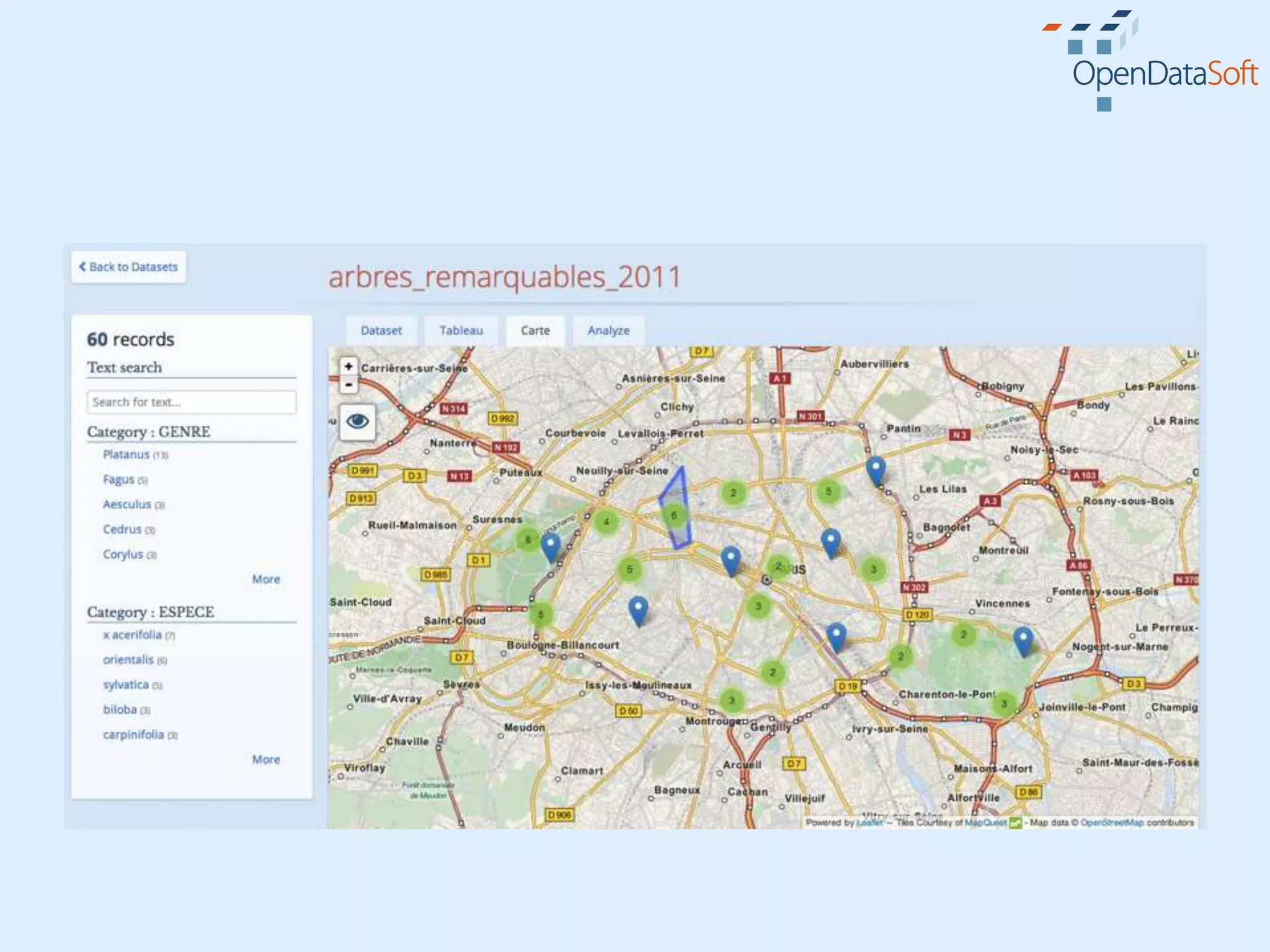 Opendatasoft est une plateforme qui facilite la collecte, la gestion et la réutilisation des données à partir de sources multiples tout en automatisant les traitements de formats et de métadonnées. Elle propose également des outils de visualisation et d'analyse, ainsi qu'une interopérabilité avec d'autres plateformes pour favoriser la mutualisation des données. Le système est conçu pour s'adapter aux nouveaux usages et accélérer l'innovation en transformant les données en revenus.