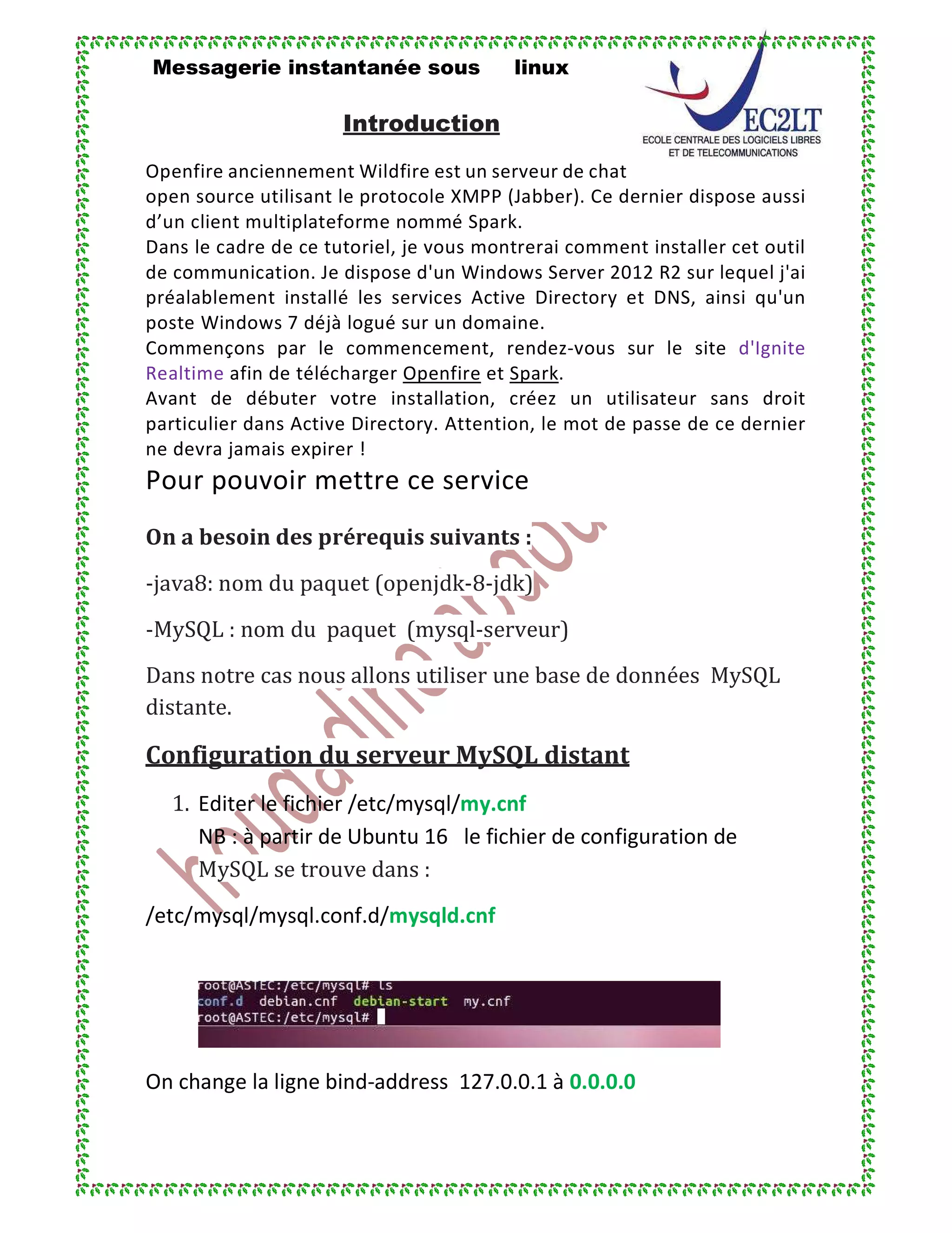 Ce document présente un guide pour l'installation d'Openfire, un serveur de chat open source utilisant le protocole XMPP, sur un système Linux, ainsi que la configuration du client Spark. Il détaille les prérequis nécessaires, la configuration d'une base de données MySQL distante, et les étapes d'installation et de configuration des deux logiciels. Les utilisateurs sont également guidés à travers le processus de création d'un compte administrateur et de connexion à l'interface utilisateur.