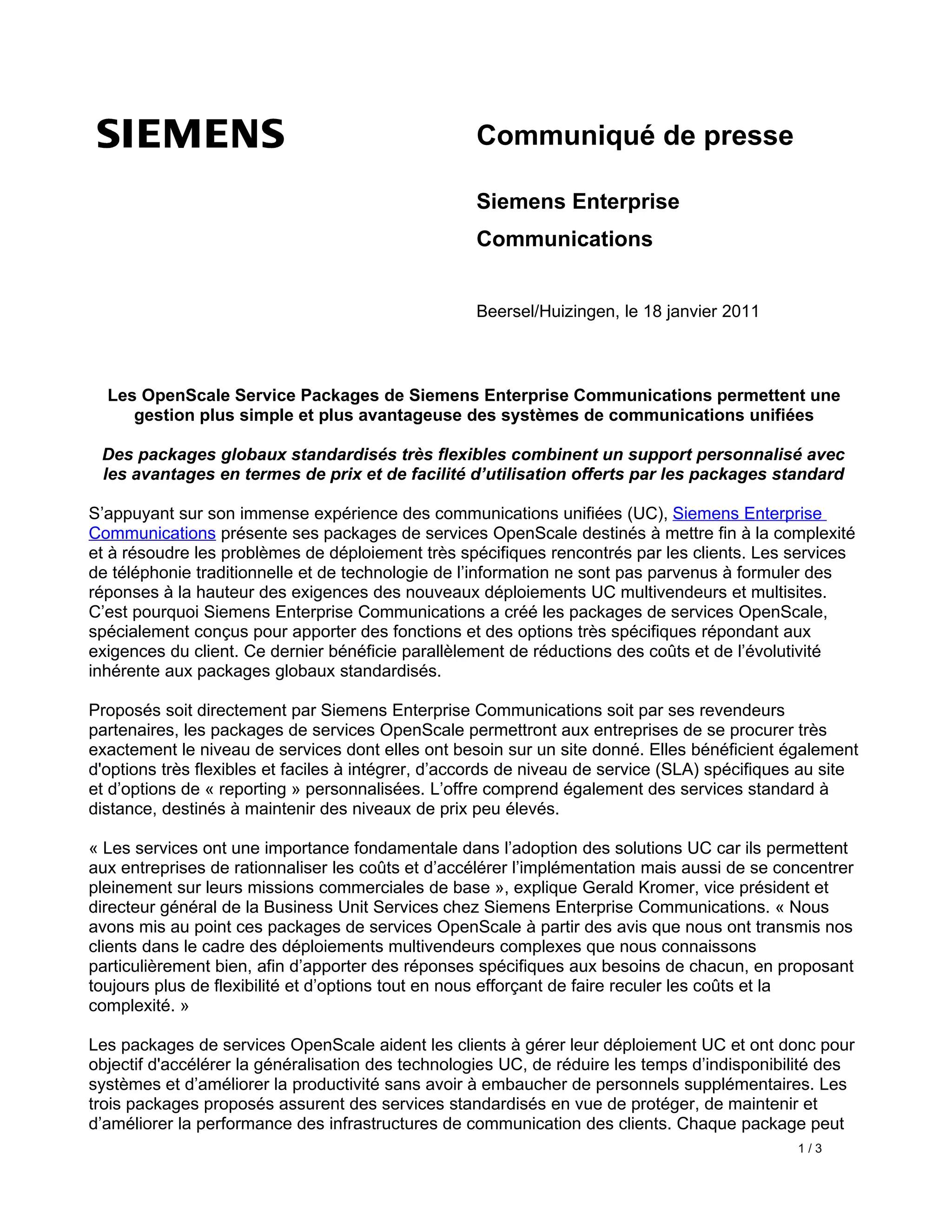 Siemens Enterprise Communications a lancé les packages de services Openscale pour simplifier la gestion des systèmes de communications unifiées, offrant flexibilité et économies de coûts aux clients. Ces services sont conçus pour répondre aux besoins spécifiques des déploiements UC multivendeurs et multisites, tout en améliorant la fiabilité et la productivité des infrastructures de communication. Les trois packages disponibles incluent des options de maintenance, de support proactif et de gestion de performance, chacun personnalisable selon les besoins du site.