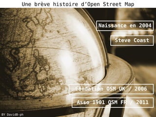 OpenStreetMap, fondé en 2004 par Steve Coast, est soutenu par l'association OSM UK et OSM France. Avec plus de 3 millions d'utilisateurs et 45 000 contributeurs mensuels, il fonctionne sur des principes de collaboration et de données ouvertes, permettant ainsi une précision accrue. Le projet a diverses applications, y compris des situations humanitaires, des fonds de carte, des pistes cyclables et des stations de ski.
