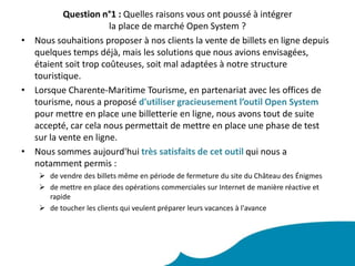 Le Château des Énigmes a intégré le système Open System pour faciliter la vente de billets en ligne, répondant à des besoins structuraux et financiers. L'outil a permis une mise en œuvre rapide et des opérations commerciales réactives, bien qu'il y ait quelques suggestions d'amélioration. Après quelques semaines d'utilisation, le bilan est positif avec 166 réservations, tout en cherchant une solution de paiement plus simple.