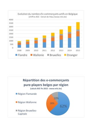 Le document présente une analyse des opportunités et défis de l'e-commerce principalement en Belgique, incluant des données sur la croissance des e-shops et les comportements d'achat en ligne. Il souligne l'importance d'une stratégie multicanal et les facteurs clés de succès pour optimiser l'expérience client. Enfin, des exemples de pratiques innovantes et d'outils numériques sont également mentionnés pour améliorer la performance des commerçants en ligne.