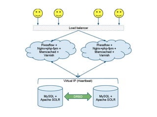 Le document présente des stratégies pour optimiser Drupal afin de gérer un trafic élevé, incluant l'utilisation de caches tels que Memcached, Varnish et Apache Solr. Il souligne l'importance de la configuration adéquate des ressources pour éviter la surcharge MySQL, et propose des solutions comme l'authcache pour les contenus dynamiques. Enfin, il conseille d'activer les caches dès que possible pour garantir des performances optimales.