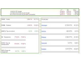 Ce document aborde l'optimisation des taux de transformation dans l'e-commerce, avec un focus sur des stratégies et des indicateurs clés à suivre pour améliorer la performance des sites. Il présente divers aspects, comme l'importance de l'expérience utilisateur, de l'accessibilité, et de la personnalisation, tout en soulignant la nécessité de générer du trafic qualifié et d'analyser des performances via des KPIs. Enfin, il souligne les défis liés au paiement en ligne et la nécessité de renforcer la confiance des consommateurs lors de l'acte d'achat.