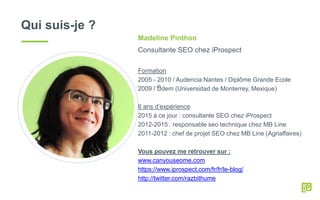 Ce document présente des méthodes pour optimiser le SEO à l'aide de Google Tag Manager, détaillant l'utilisation des balises, déclencheurs et variables pour manipuler les éléments de page tels que les titres et les meta descriptions. L'auteur, Madeline Pinthon, explique également l'importance de la couche de données (datalayer) pour intégrer des données structurées et améliore la compréhension des pages par Google. Enfin, elle mentionne des pratiques supplémentaires pour la gestion SEO via GTM tout en soulignant des réserves sur certaines méthodes.