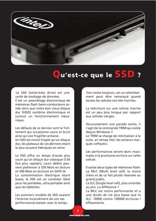 Le document explique les avantages des disques SSD par rapport aux HDD, notamment leur rapidité, leur résistance aux chocs et leur faible consommation électrique. Il traite également des optimisations à effectuer pour prolonger la durée de vie d'un SSD, comme l'activation du mode AHCI et le déplacement de certains dossiers sur un HDD. Enfin, il recommande des logiciels pour aider à optimiser les performances des SSD et souligne l'importance de la commande TRIM.