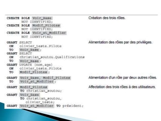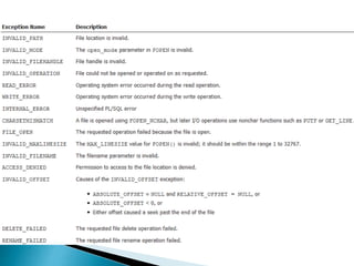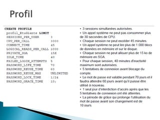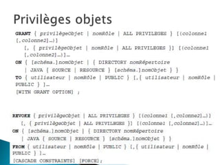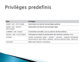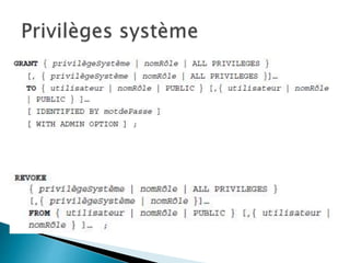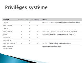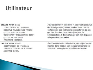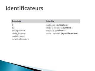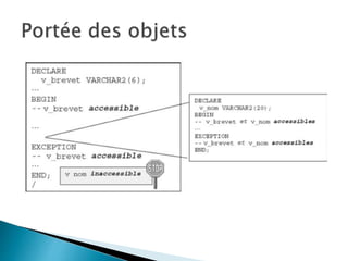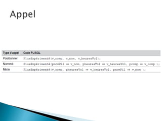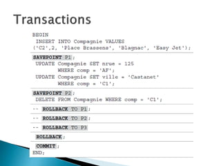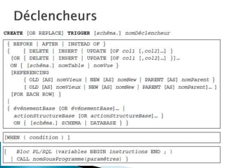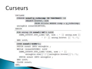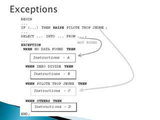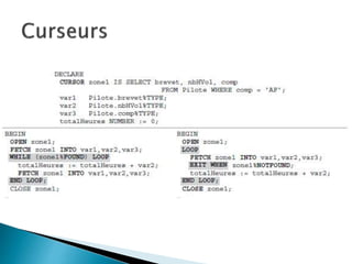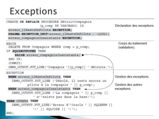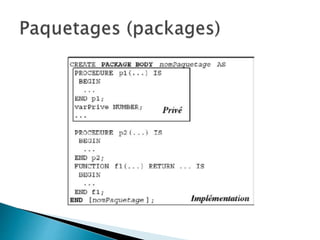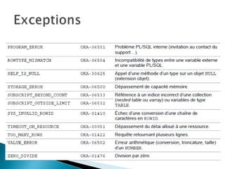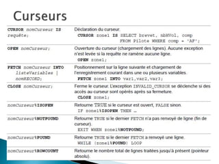 Le document traite du SQL procédural d'Oracle, mettant en avant des caractéristiques clés telles que la modularité, la portabilité et l'intégration avec les données des tables. Il aborde également l'utilisation de blocs PL/SQL, les transactions, ainsi que la gestion des erreurs et des curseurs. De plus, le document décrit des procédures, fonctions, et déclencheurs, offrant des exemples pratiques et des directives pour une utilisation efficace.