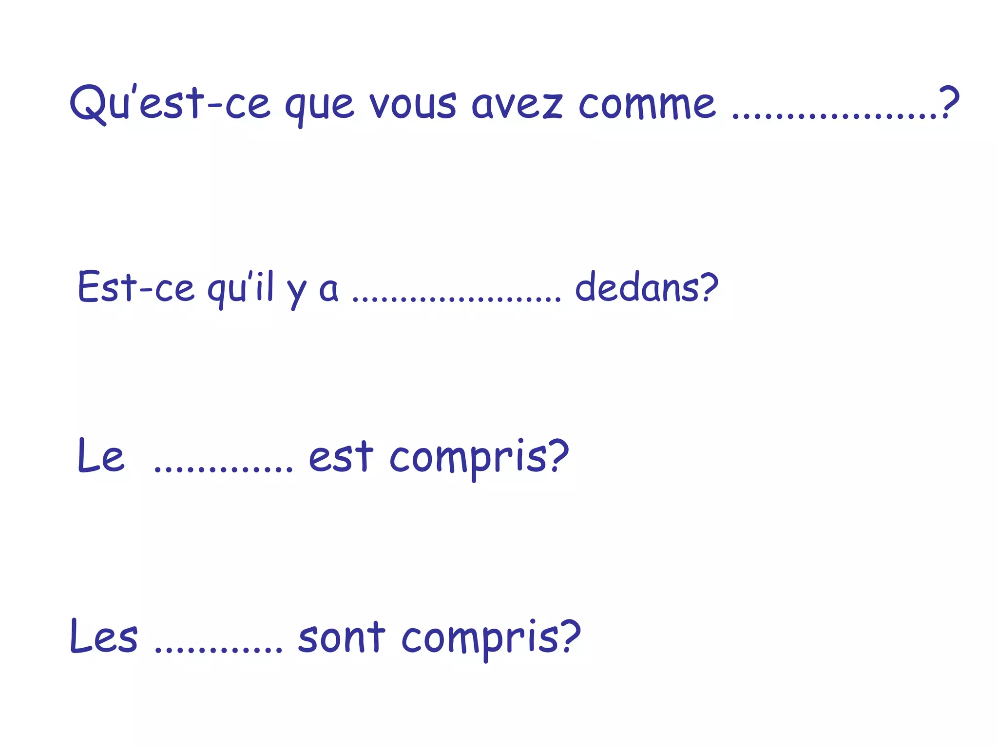 Le document semble être une série de questions concernant le contenu et les éléments inclus. Il pose des questions sur la présence d'objets ou d'informations spécifiques. Les numéros mentionnés pourraient référencer des points ou des éléments à vérifier.
