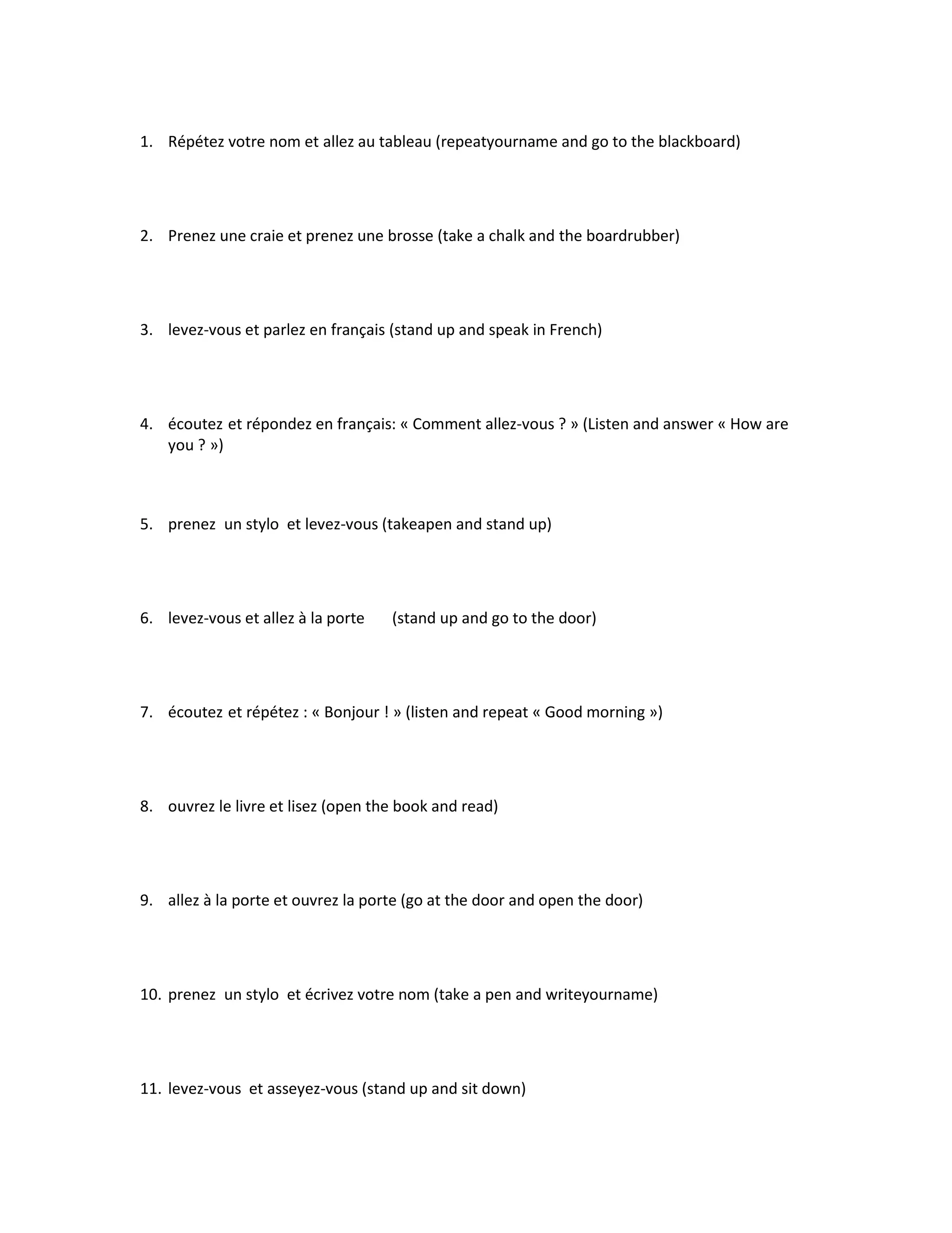 Le document présente une série d'instructions en français pour des actions simples à effectuer, telles que parler, écouter, écrire et interagir avec des objets de la classe. Chaque instruction guide l'utilisateur à travers des activités linguistiques et pratiques pour faciliter l'apprentissage du français. L'ensemble des directives vise à encourager la participation active et l'usage de la langue.