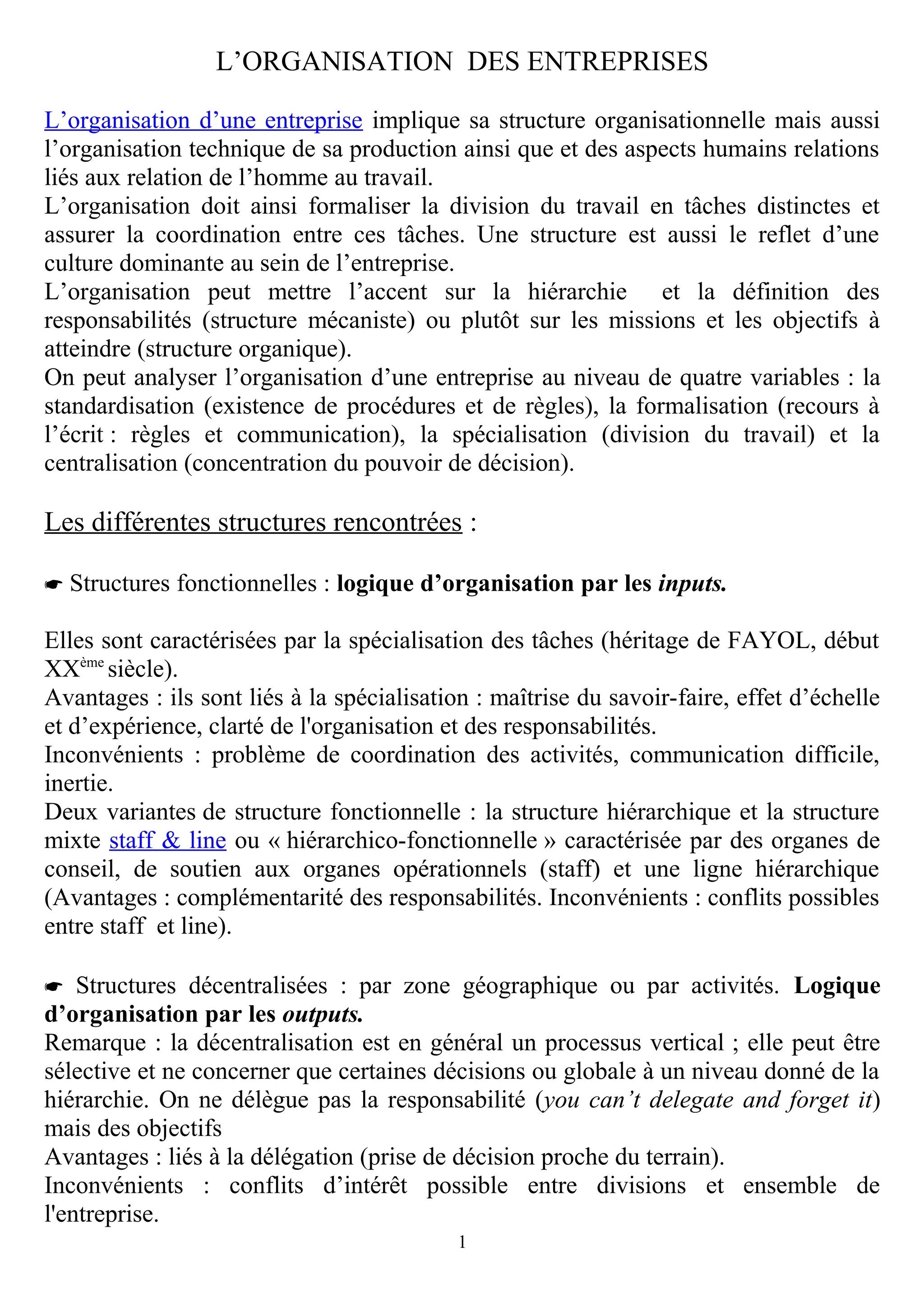 L'organisation d'une entreprise se définit par sa structure, sa division du travail et les relations humaines au travail. Les structures organisationnelles varient de fonctionnelles à décentralisées en passant par matricielles, chacune ayant ses avantages et inconvénients en termes de coordination et d'efficacité. Les facteurs déterminants de la structure incluent le secteur d'activité, la taille de l'entreprise et la stratégie, tandis que l'évolution tend vers des formes d'organisations plus flexibles et adaptées aux environnements instables.