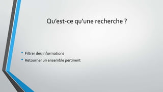 Elasticsearch est un moteur de recherche et d'analyse open source basé sur Apache Lucene, permettant de filtrer et retourner des informations sous forme de documents JSON. Il fonctionne sur une architecture RESTful, supporte diverses opérations comme ajout, édition et suppression, et propose des fonctionnalités avancées telles que la gestion de la sécurité et des alertes. Des outils complémentaires tels que Logstash, Kibana et Beats enrichissent son écosystème pour le transport, la visualisation et la collecte de données.