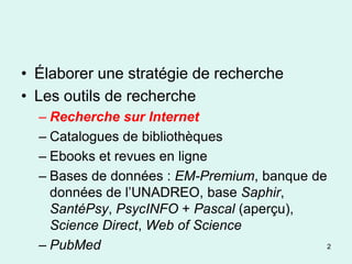 Le document présente des stratégies et outils de recherche d'informations médicales, en mettant l'accent sur l'utilisation de moteurs de recherche et bibliothèques en ligne. Il évoque des ressources comme Google Scholar et Exalead, ainsi que des conseils pour affiner les recherches. Enfin, il explique comment reconnaître un site de qualité en santé grâce à la certification HON.