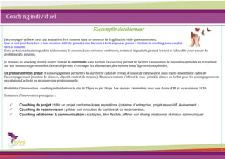 Oseal Coaching offre des services de coaching individuel et d'accompagnement pour les entreprises, axés sur le changement, la reconversion professionnelle et le développement des compétences. Les séances, qui peuvent se dérouler sur site ou par Skype, visent à aider les clients à surmonter des défis en clarifiant des objectifs et en optimisant les relations interpersonnelles. Des forfaits et des ateliers sont proposés, avec une attention particulière sur l'accompagnement des femmes dans l'entrepreneuriat et l'amélioration de la communication au sein des équipes.
