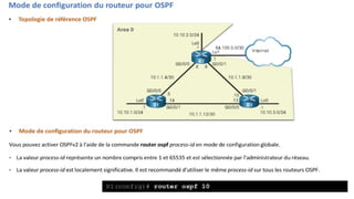 Le document fournit une vue d'ensemble détaillée du protocole de routage OSPF (Open Shortest Path First), y compris sa définition, ses types de paquets, sa configuration pour OSPFv2 et OSPFv3, ainsi que les concepts des zones et des états opérationnels. OSPF est un protocole permettant aux routeurs d'échanger des informations sur les routes pour déterminer le meilleur chemin à travers un réseau. Les configurations abordées incluent des exemples de syntaxe de commandes pour activer OSPF dans différentes topologies de réseau.