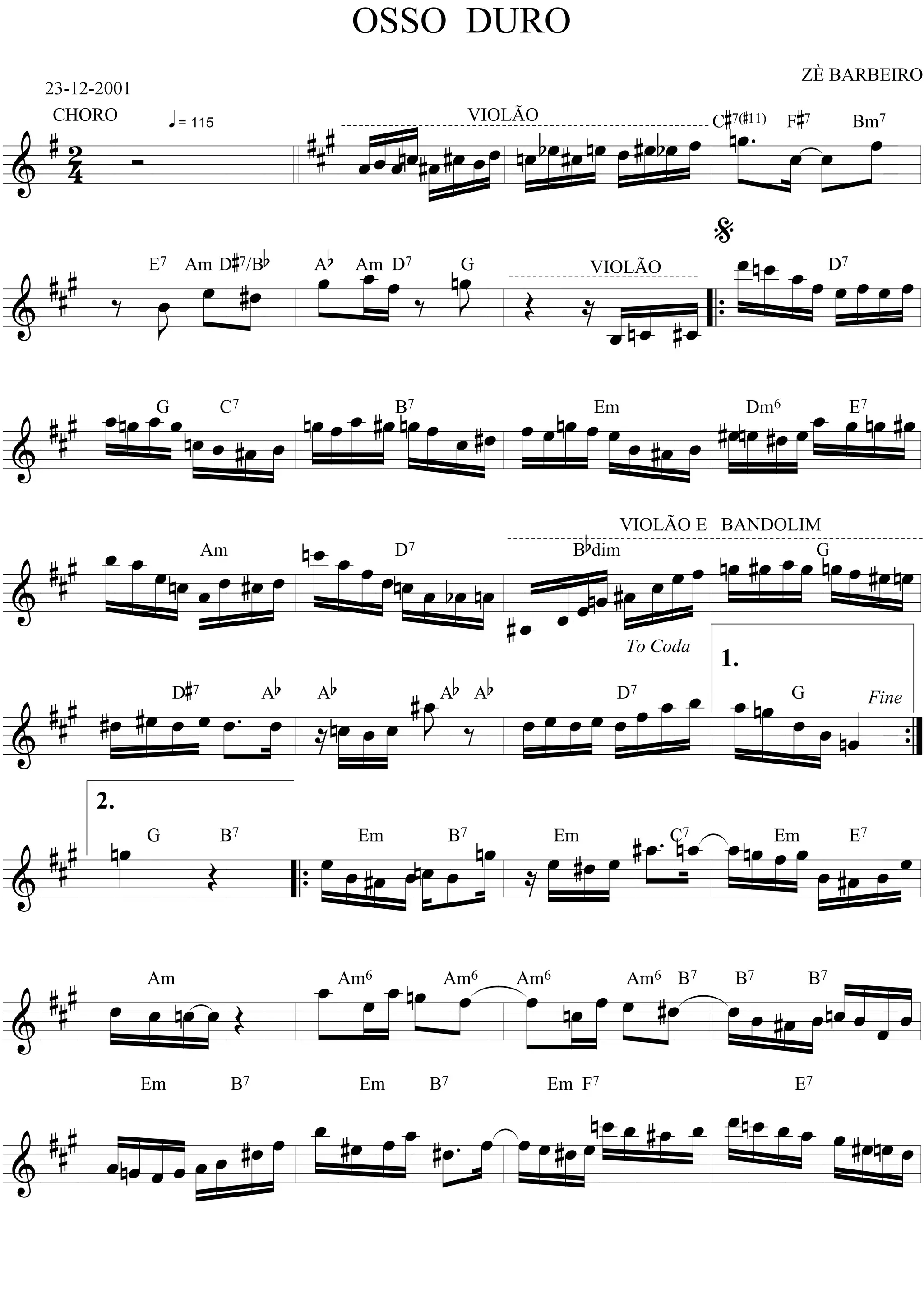 Le document semble contenir une partition de musique, possiblement pour un morceau de choro, avec des instructions et des notations pour divers instruments comme le violão et le bandolim. Il inclut des sections répétées et des indications musicales spécifiques. Les annotations sont interspersées avec des symboles et chiffres, indiquant les accords et les rythmes.