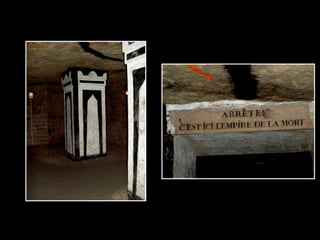 Le document présente une exploration de l'ossuaire de Denfert-Rochereau, mettant en lumière ses caractéristiques macabres à travers des descriptions de plaques, tombes et éléments architecturaux. Des remerciements sont également adressés aux institutions qui ont contribué à la recherche et à la documentation des lieux. L'ossuaire fait référence à des souvenirs et des mémoriaux, soulignant l'importance historique et culturelle de cet endroit.