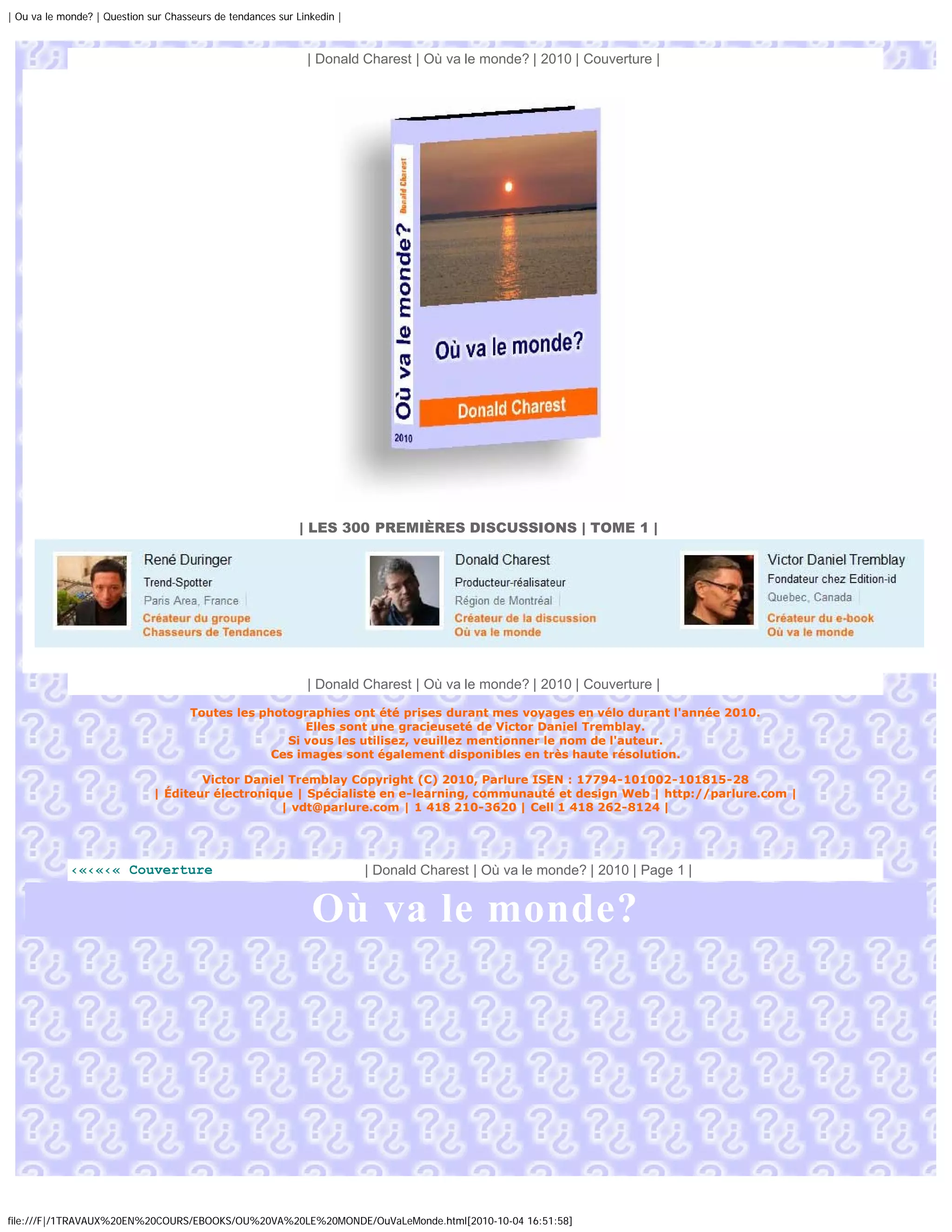 Le document présente une discussion sur l'état actuel et futur du monde, où divers participants expriment des opinions sur les défis, catastrophes et espoirs qui le caractérisent. Les échanges reflètent une tension entre pessimisme face à la situation mondiale et optimisme sur le potentiel de changement positif. Les réflexions incluent également des références à l'histoire et des prédictions technologiques, mettant en avant la complexité du progrès humain.