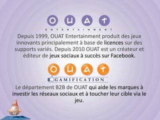 Ouat Entertainment se spécialise dans la création et l'édition de jeux sociaux, intégrant des marques à travers des placements de produits et des jeux sponsorisés sur des plateformes comme Facebook. Cela permet aux marques d'atteindre un public engagé, tout en proposant des expériences ludiques à forte valeur ajoutée. Avec un modèle économique basé sur l'innovation publicitaire, Ouat vise à maximiser le retour sur investissement pour les annonceurs tout en répondant à une audience connectée et mature.