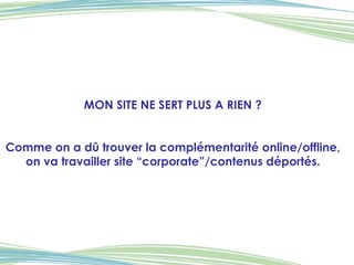 Le document aborde l'idée de complémentarité entre les actions en ligne et hors ligne pour dynamiser les activités touristiques, tout en soulignant l'importance de la mutualisation et de la formation face à des ressources humaines limitées. Il propose de travailler avec les étudiants et de réorienter les priorités vers l'animation touristique. Enfin, il insiste sur la nécessité de créer des partenariats et d'adopter de nouveaux outils technologiques pour améliorer l'expérience des visiteurs et promouvoir la destination.
