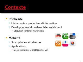 Le document aborde l'impact de l'infobésité et le rôle de l'internaute en tant que producteur d'informations au sein du développement du web social et collaboratif. Il présente un outil de veille stratégique visant à détecter et analyser les informations en temps réel, avec des exemples de catastrophe naturelle et de mouvements sociaux en France. Le prototype de l'outil traite jusqu'à 1400 messages par minute, avec une précision de 70% à 90% pour la validation sémantique.