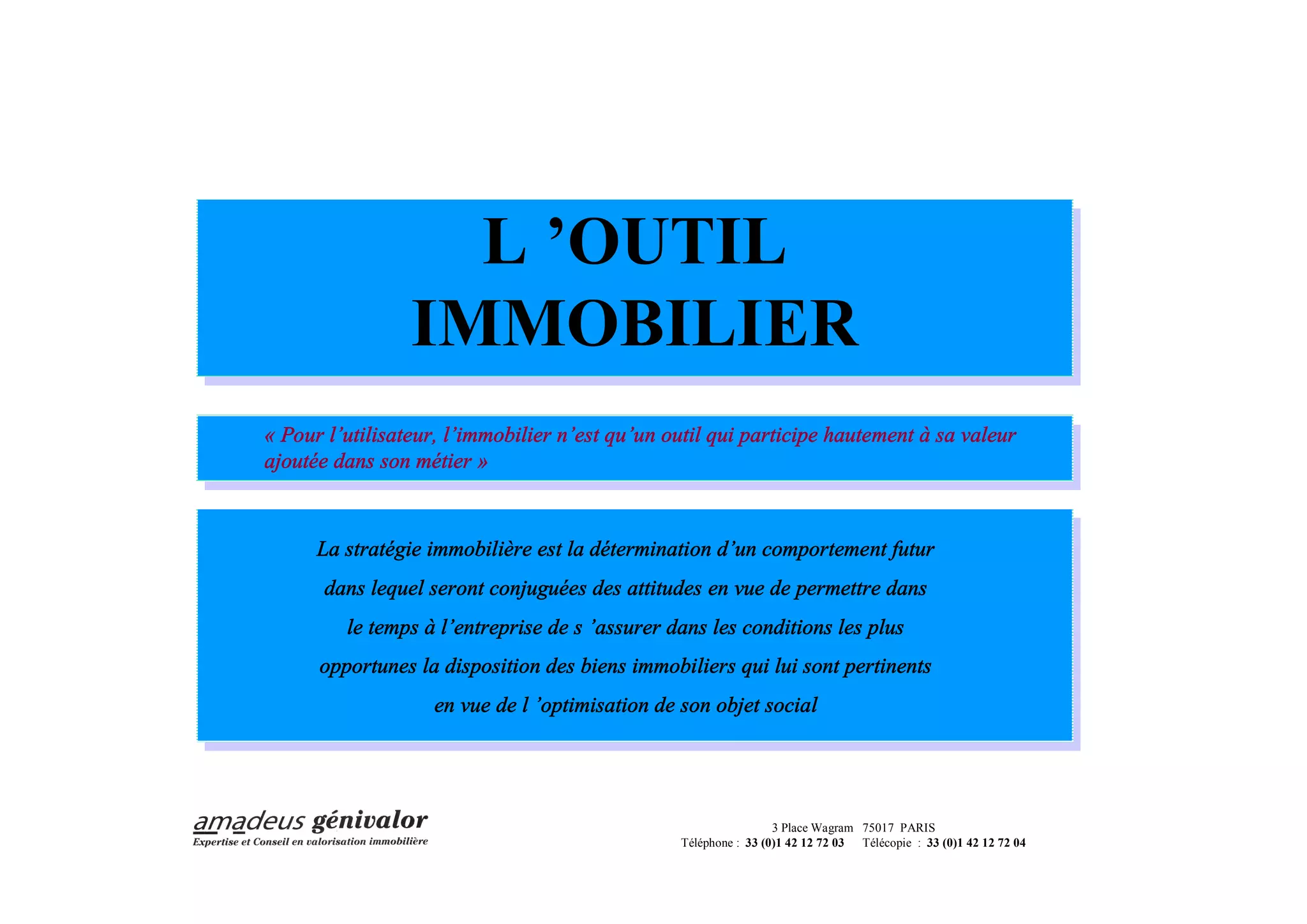 Le document traite de la stratégie immobilière comme un outil essentiel pour optimiser la valeur ajoutée d'une entreprise, soulignant son rôle dans la gestion des biens immobiliers en fonction des besoins stratégiques et opérationnels. Il aborde également les enjeux financiers et les méthodes d'évaluation des actifs immobiliers, ainsi que les choix entre propriété et location selon les objectifs de l'entreprise. Au final, la stratégie immobilière est présentée comme un levier crucial pour le développement et la pérennité des entreprises.