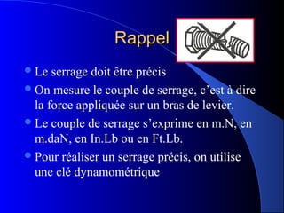 Le document présente les méthodes et outils nécessaires pour effectuer un serrage précis des vis et écrous dans le cadre aéronautique, en insistant sur l'importance d'utiliser une clé dynamométrique correctement étalonnée. Il détaille également les conversions d'unités de couple et fournit des recommandations pour le choix et l'utilisation des clés de serrage en fonction de la qualité et du diamètre des vis. Des procédures d'étalonnage, de vérification et des risques associés à un serrage inapproprié sont également abordés.