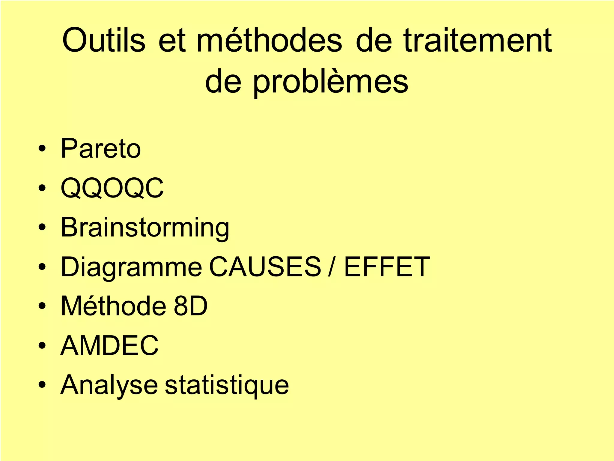 Le document présente des outils et méthodes pour le traitement de problèmes, notamment le diagramme de Pareto, le brainstorming et la méthode 8D, en détaillant leurs objectifs, processus et applications. Il fournit également des explications sur les diagrammes de causes/effet, la méthode AMDEC pour l'analyse des modes de défaillance et leurs effets. Chaque méthode est illustrée par des exemples pratiques et des conseils pour assurer leur efficacité dans la résolution de problèmes.