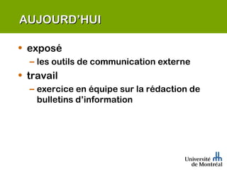 Le document présente une analyse des outils de communication externe, notamment les brochures institutionnelles, dépliants et bulletins d'information, en mettant en avant leur objectif de communiquer efficacement avec divers publics. Il souligne l'importance de l'approche active dans la rédaction, l'attrait visuel, et la structure des messages pour engager le lecteur. Enfin, des conseils techniques sont fournis pour optimiser la clarté et l'impact des contenus de communication.