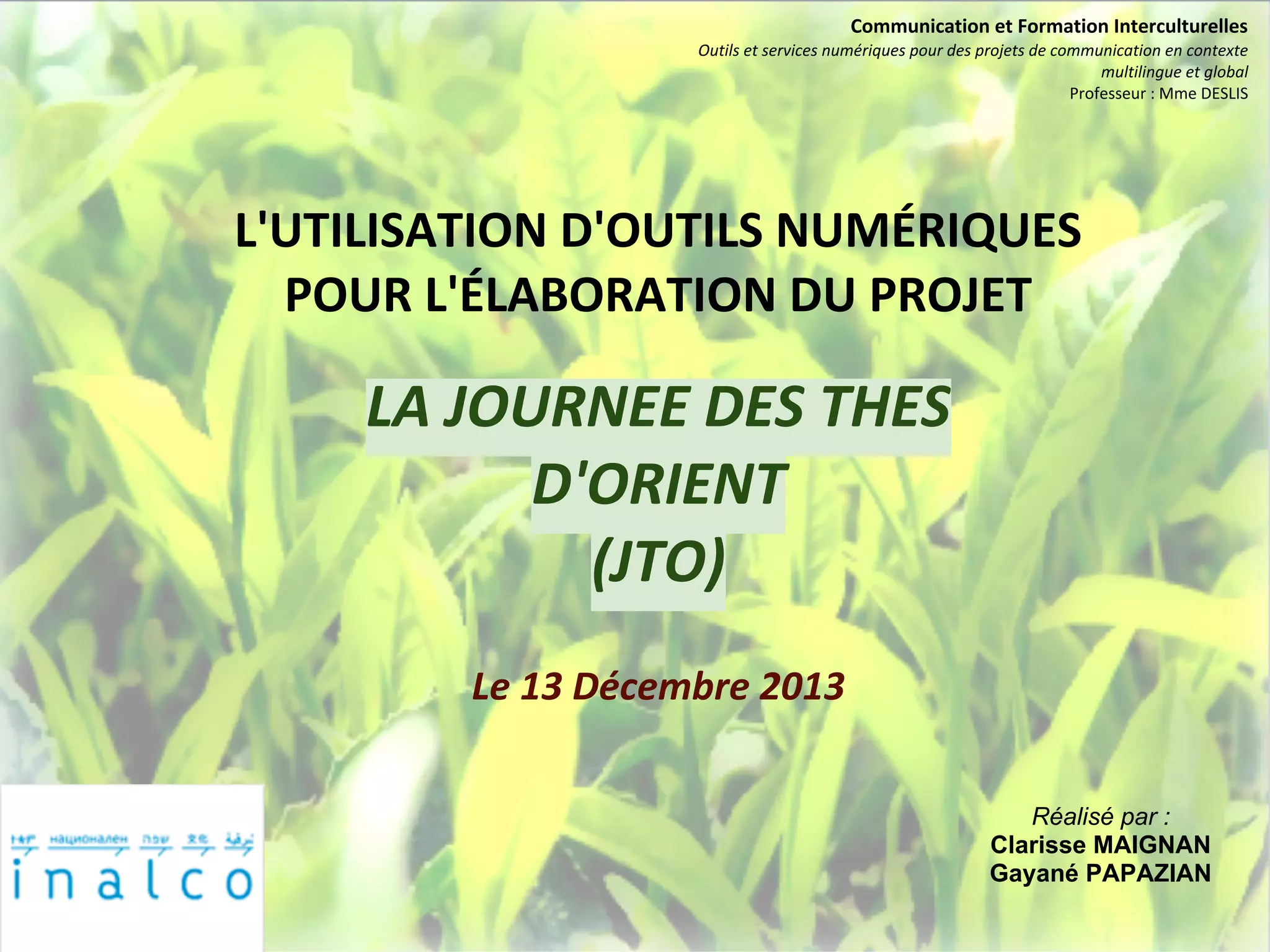 Le document présente des outils numériques utilisés pour le projet 'Journée des thés d'Orient' (JTO) à l'INALCO, organisé le 13 décembre 2013. Il décrit des ressources telles que Petale Graphique, Google Docs, et Facebook pour planifier, partager et promouvoir l'événement, ainsi qu'une analyse SWOT pour identifier les forces et faiblesses du projet. La utilisation de ces outils favorise la collaboration et la communication entre les membres de l'équipe, même à distance.
