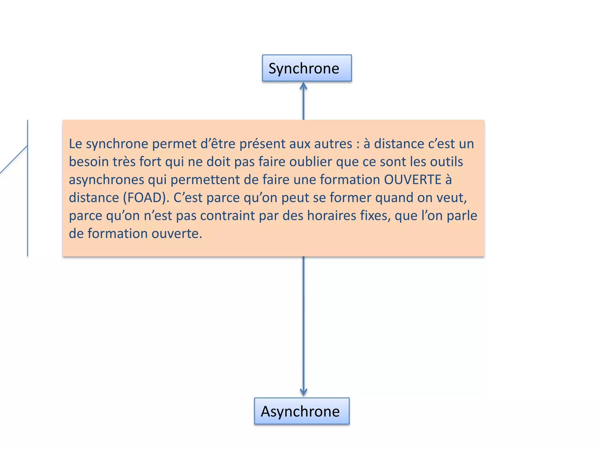 Le document examine l'importance des outils synchrone et asynchrone dans la formation ouverte à distance, soulignant que les outils asynchrones permettent de se former à son propre rythme. Il décrit l'évolution des outils de communication et d'interaction, tels que les chats et les plateformes de formation, qui facilitent l'accompagnement et la collaboration entre apprenants. La nécessité d'équilibrer l'utilisation de ces outils est également mentionnée pour éviter la dispersion des utilisateurs.