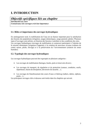 Le document décrit les pertes de charge et le dimensionnement des ouvrages d'irrigation au Maroc, incluant des détails sur les canaux, les ouvrages de prise, de partiteur, de sécurité, et de chute. Il fournit des formules techniques pour le calcul de débits et la conception d'ouvrages, et aborde également les considérations sur les matériaux et les sections de ces ouvrages. Des précautions pour éviter les dépôts et garantir l'efficacité hydraulique sont également discutées.