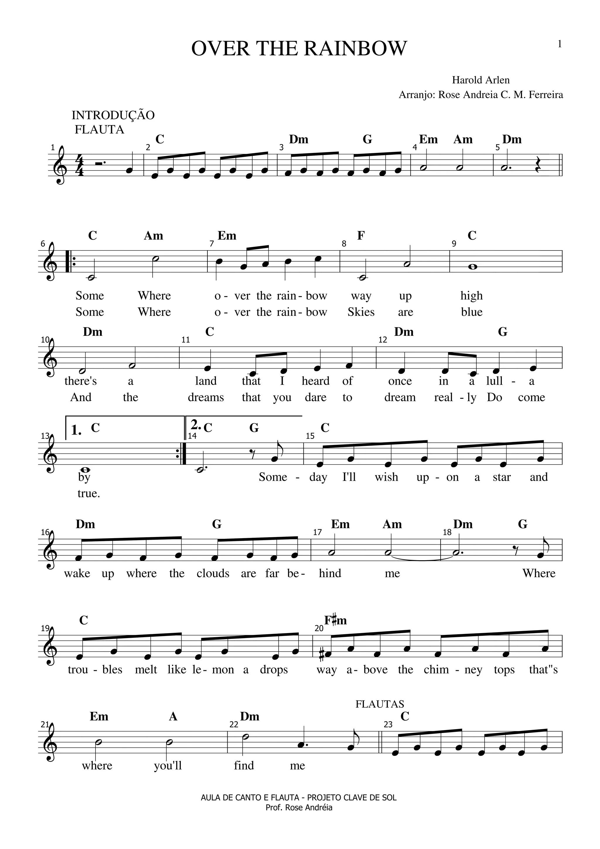 Le document est une partition musicale de la chanson 'Over the Rainbow' de Harold Arlen, arrangée par Rose Andréia C. M. Ferreira. Il contient des annotations pour les flûtistes et des paroles de la chanson. Le texte évoque des thèmes de rêve, d'espoir et de quête d'un endroit meilleur.