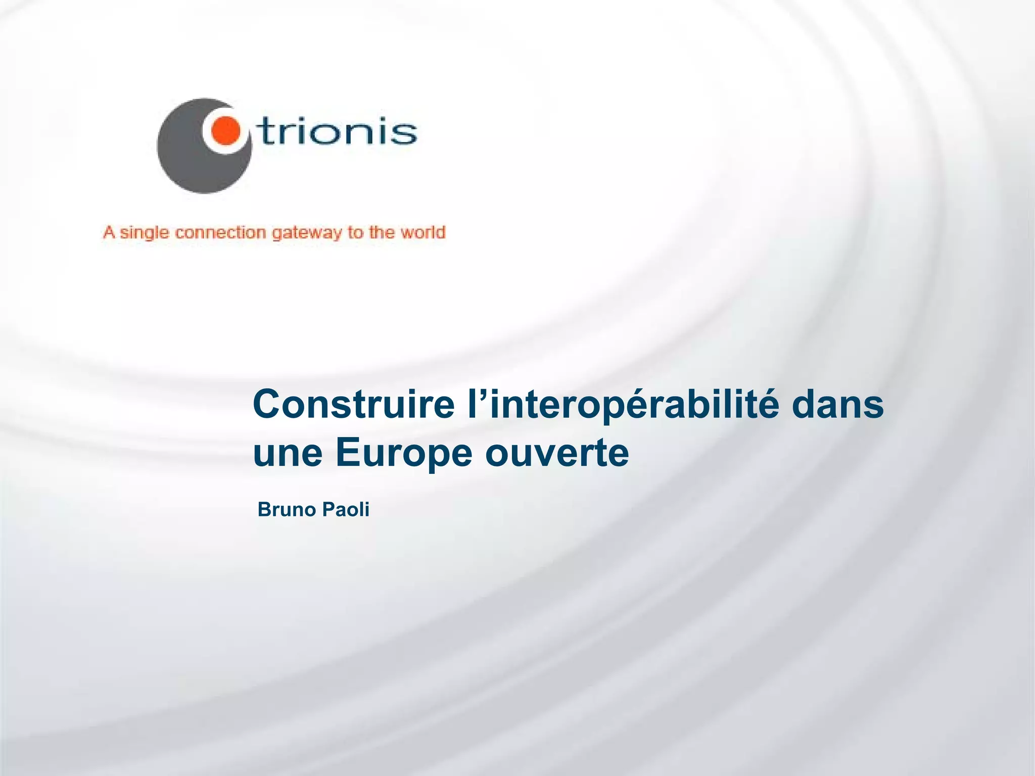 La conférence de Bruno Paoli souligne l'importance des systèmes de cartes harmonisés en Europe pour compléter le projet du marché unique européen, actuellement en développement. Trionis, opérateur de réseau, cherche à élargir sa portée et optimiser les services de traitement, tout en favorisant des partenariats pour intégrer divers acteurs du secteur. Le document met en évidence la nécessité d'améliorer l'interopérabilité et d'explorer davantage de possibilités pour renforcer le marché des paiements par carte en Europe.
