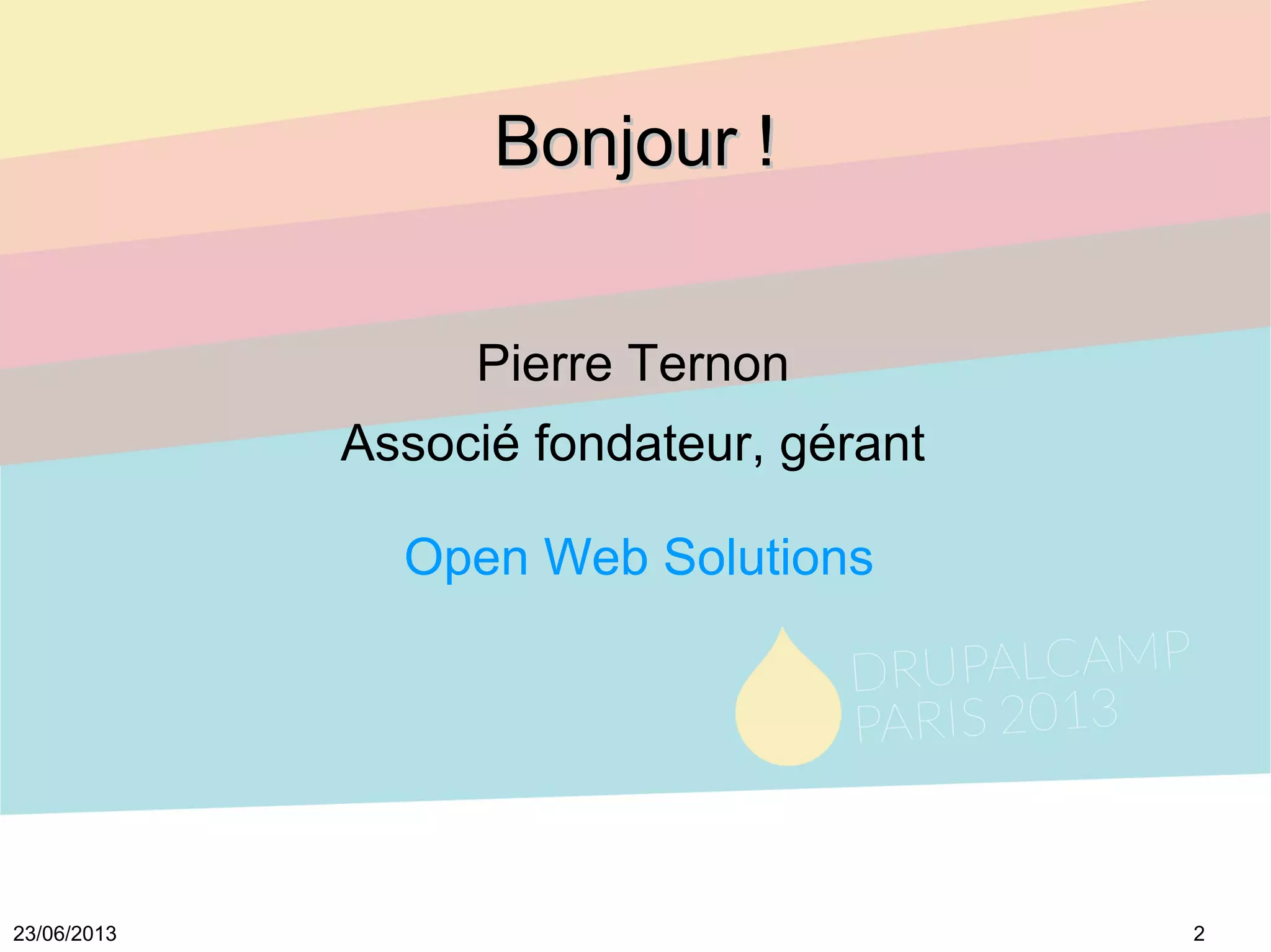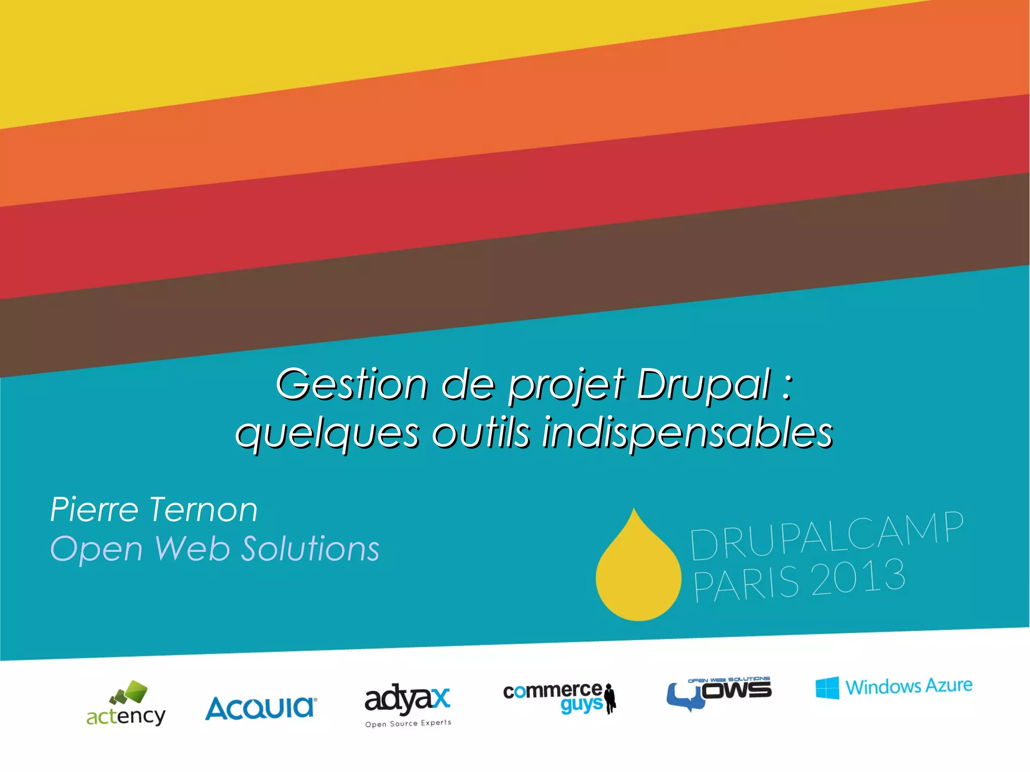 Le document présente des outils essentiels pour la gestion de projet Drupal, en mettant l'accent sur des éléments comme Redmine pour la gestion documentaire, le versionnement avec Git, et l'utilisation de Drush pour automatiser certaines tâches. Il aborde la communication en ligne via IRC et l'importance des tests avec Selenium, ainsi que la montée en charge avec Tsung. Des recommandations sur le déploiement sont également fournies, soulignant l'intégration continue et la documentation des processus.