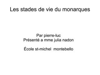 Le document décrit les stades de vie du papillon monarque, depuis la ponte des œufs par les femelles sur les feuilles d'asclépiade jusqu'à la sortie du papillon adulte après une transformation en chrysalide. Les chenilles se nourrissent exclusivement d'asclépiade et subissent plusieurs mues pour grandir avant de se transformer. Une fois adultes, les papillons se nourrissent de nectar de diverses fleurs.