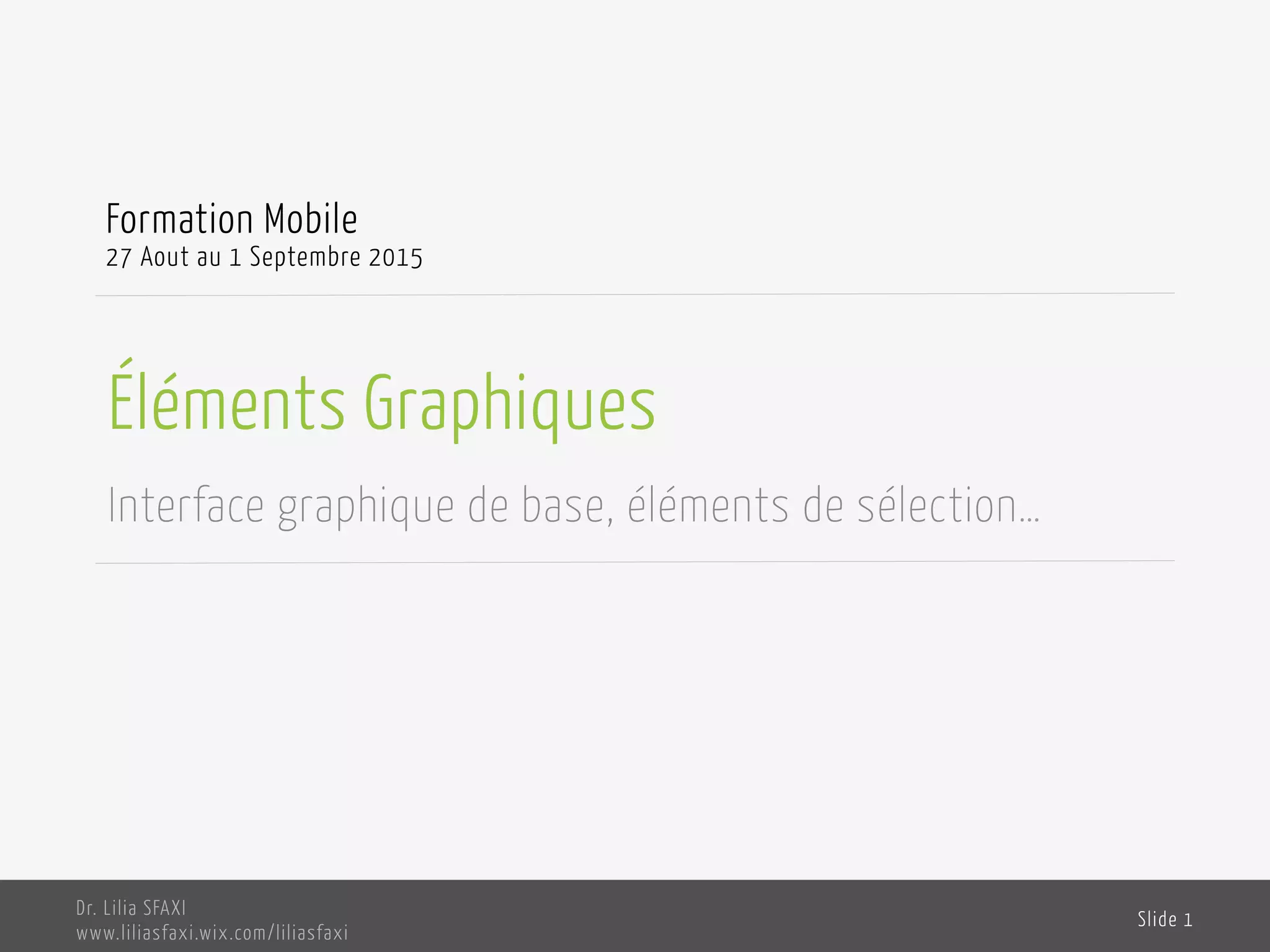 Le document présente une formation sur les éléments graphiques de base d'une interface Android, incluant les classes View et ViewGroup, ainsi que la création et l'utilisation de fichiers XML pour le layout d'applications. Il détaille les différentes manières de définir le comportement des éléments graphiques, comme les boutons, et évoque la structure et le cycle de vie d'une application Android. Des ateliers pratiques sont également proposés pour aider les participants à mettre en œuvre ces concepts dans des projets concrets.