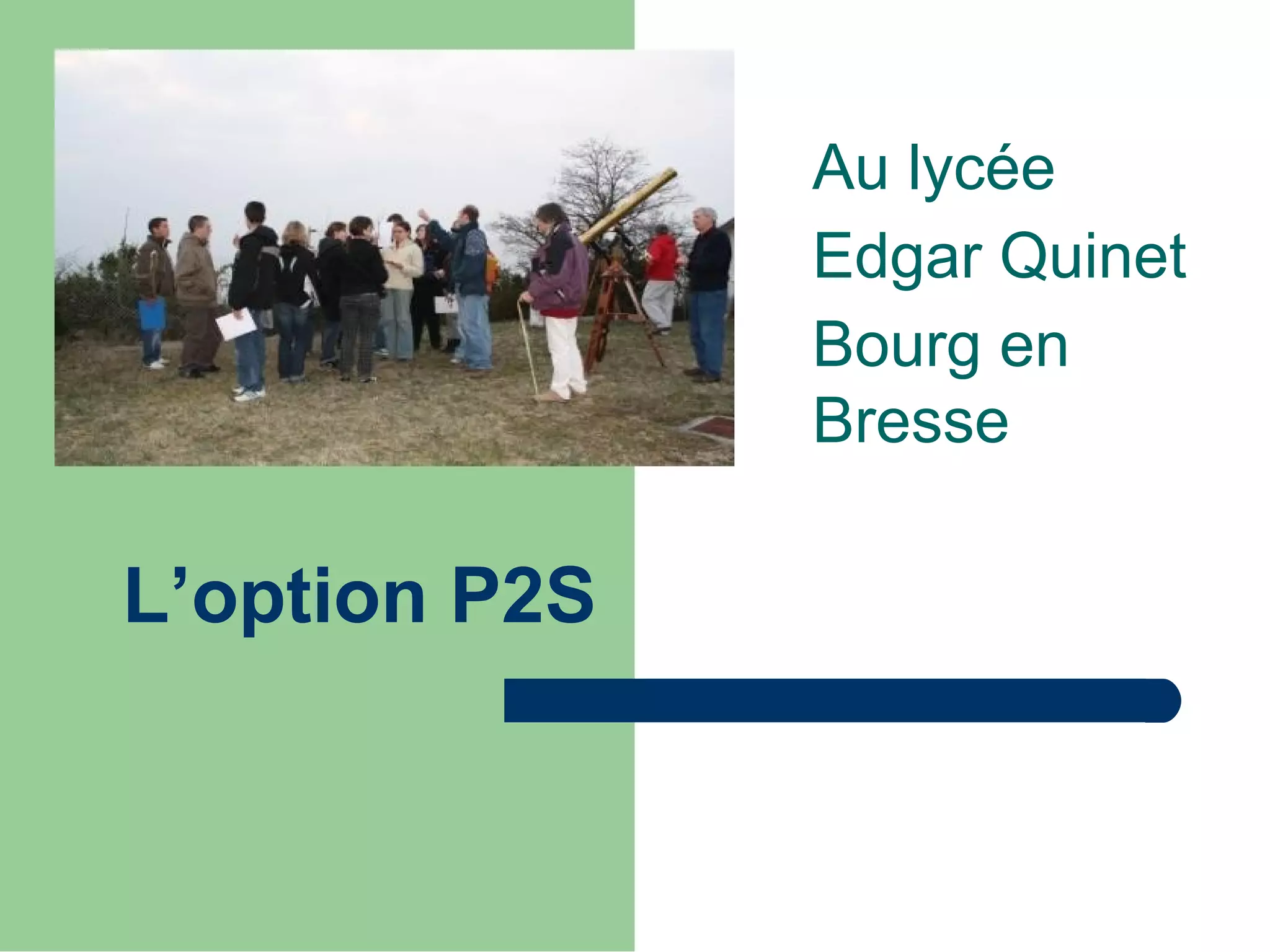 L'option P2S au lycée Edgar Quinet pour l'année 2008-2009 a permis aux élèves de développer leur raisonnement et compétences scientifiques à travers des activités pratiques en groupes. Ils ont exploré des thèmes tels que la vision et l'astronomie tout en utilisant des méthodes variées allant des expériences aux modélisations. Les élèves ont également participé à des conférences et à la fête de la science, animant des ateliers pour les élèves du primaire.