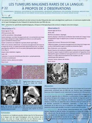 Le document présente deux cas de tumeurs malignes rares de la langue, un lymphome non hodgkinien et un fibrosarcome, mettant en évidence leurs caractéristiques cliniques, épidémiologiques et thérapeutiques. Le lymphome, bien que rare, présente une évolution favorable après traitement, tandis que le fibrosarcome, également rare, nécessite une prise en charge rapide pour un meilleur pronostic. La rareté de ces entités et le manque de données claires compliquent leur gestion clinique.