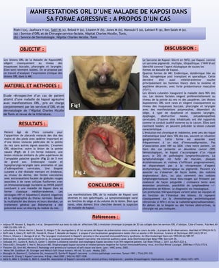 Le document présente un cas de maladie de Kaposi agressive avec manifestations orl chez un patient de 77 ans, mettant en évidence des lésions spécifiques et une prise en charge interdisciplinaire. L'analyse souligne la rareté des manifestations orl isolées et leur association avec un état d'immunodépression, tout en précisant que le diagnostic repose sur l'histologie et que le traitement comprend la chimiothérapie. La nécessité d'explorer ces manifestations dans le cadre de la maladie de Kaposi est également soulignée.