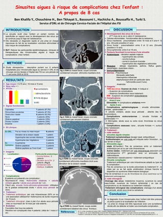 Ce document traite des sinusites aigües à risque de complications chez l'enfant, en se basant sur une étude rétrospective de 8 cas hospitalisés entre 2005 et 2016. Il souligne l'importance d'un diagnostic précoce et d'une prise en charge rigoureuse, avec des détails sur les symptômes, les complications potentielles, et les traitements médicaux et chirurgicaux. Les résultats montrent une évolution favorable dans la majorité des cas, malgré quelques récidives et complications observées.