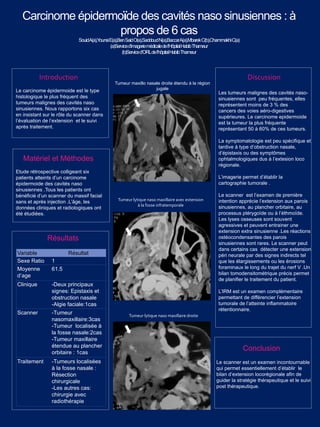 Ce document présente une étude rétrospective de six cas de carcinome épidermoïde des cavités naso-sinusiennes, soulignant l'importance du scanner pour évaluer l'extension et le suivi post-thérapeutique. Les résultats montrent que ce type de tumeur représente 50 à 60% des cancers des cavités naso-sinusiennes, avec des signes cliniques peu spécifiques. La tomodensitométrie est essentielle pour la cartographie tumorale et la planification du traitement.