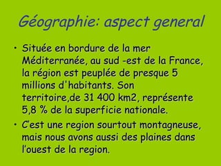 La région Provence-Alpes-Côte d'Azur, située au sud-est de la France, a une population de près de 5 millions d'habitants et couvre un territoire de 31 400 km2, principalement montagneux. Elle présente deux climats, méditerranéen et montagnard, favorisant des activités agricoles variées et une industrie diversifiée, incluant la pétrochimie et la microélectronique. En outre, c'est la première région française en matière de tourisme national et la deuxième pour le tourisme international.
