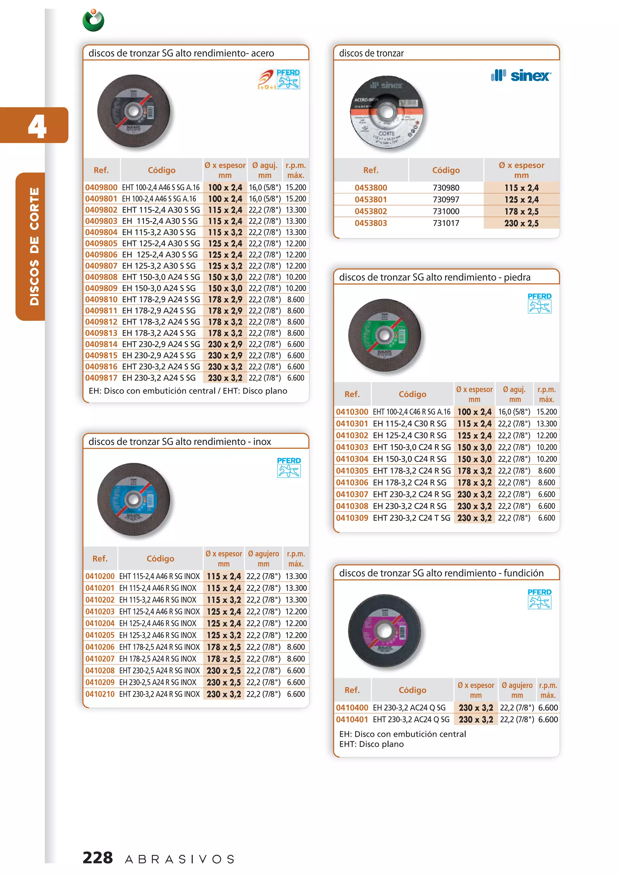 Le document présente une liste de disques de tronçonnage en acier et en matériaux divers, avec des détails tels que les dimensions, l'épaisseur, le type de montage et la vitesse maximale en tours par minute (rpm). Les produits sont classés par type de matériau, incluant des spécifications pour l'acier, l'inox, et la pierre. Chaque disque est identifié par un code de référence unique.